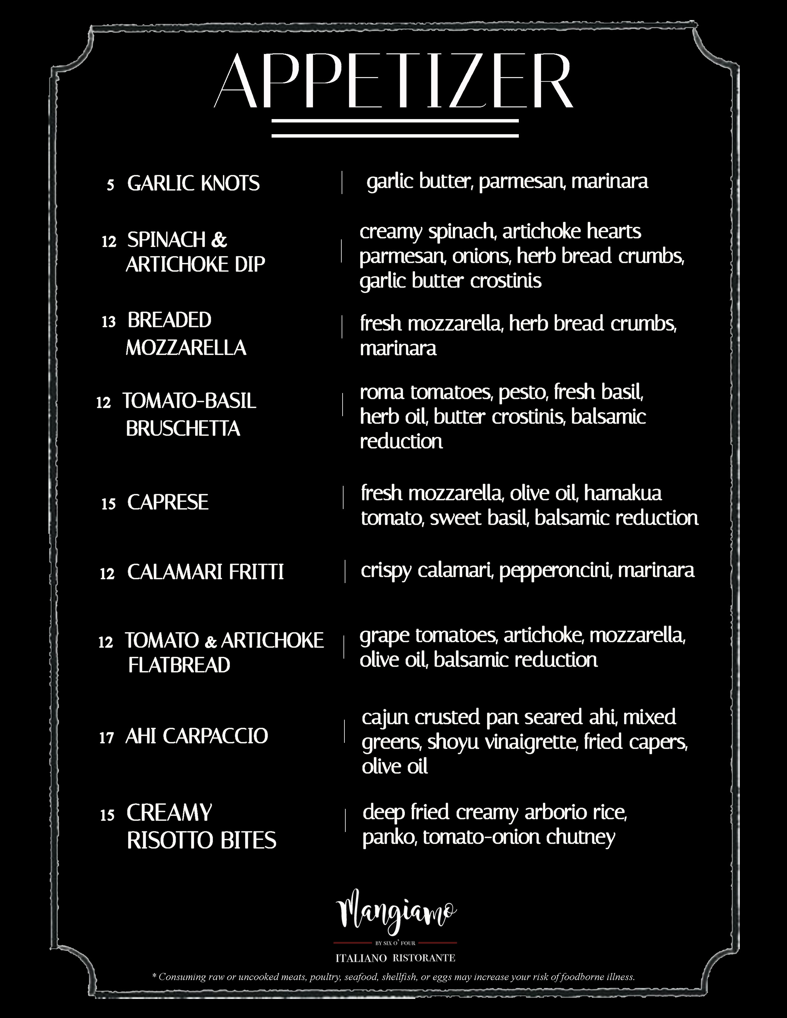Located at the beautiful Navy Marine Golf Course, Mangiamo overlooks the scenic greens and boasts an open-air Lanai. Quality Italian Cuisine for the whole family.
